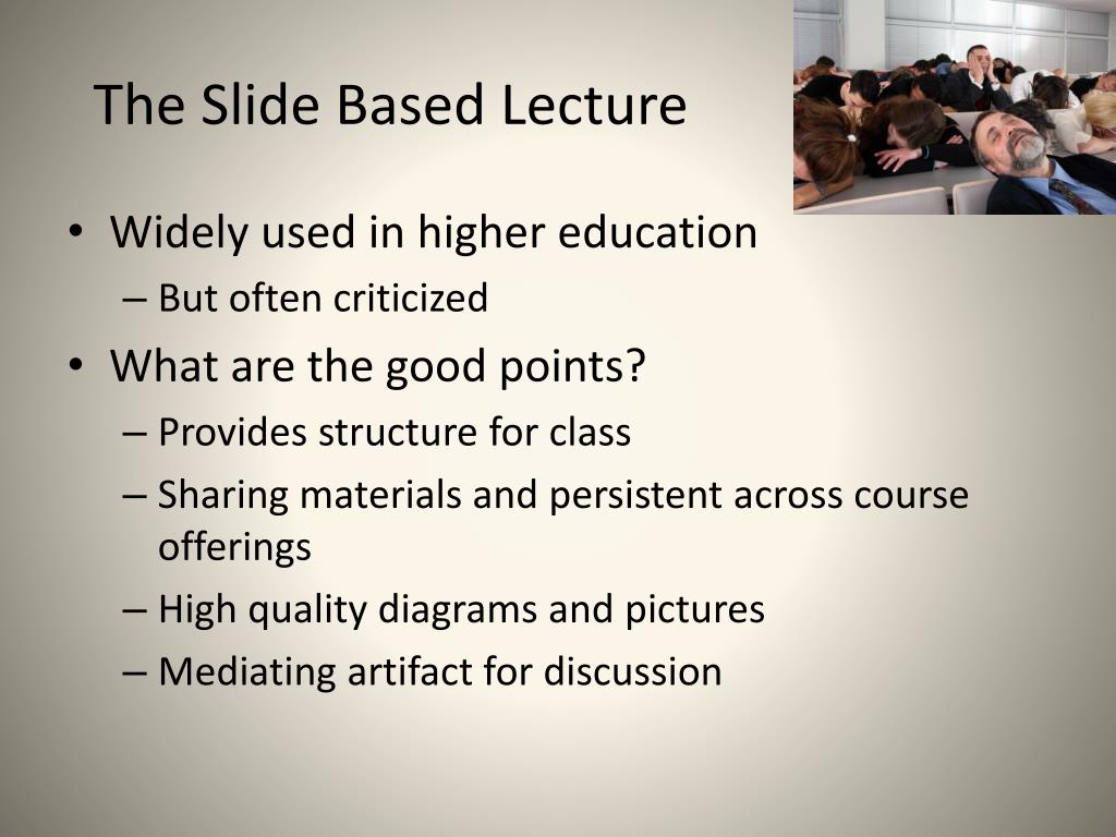 The Slide Based Lecture • Widely used in higher education • But often criticized • What are the good points? • Provides structure for class • Sharing materials and persistent across course offerings • High quality diagrams and pictures • Mediating artifact for discussion