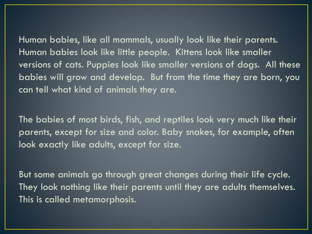Human babies, like all mammals, usually look like their parents. Human babies look like little people. Kittens look like smaller versions of cats. Puppies look like smaller versions of dogs. All these babies will grow and develop. But from the time they are born, you can tell what kind of animals they are. The babies of most birds, fish, and reptiles look very much like their parents, except for size and color. Baby snakes, for example, often look exactly like adults, except for size. But some animals go through great changes during their life cycle. They look nothing like their parents until they are adults themselves. This is called metamorphosis.