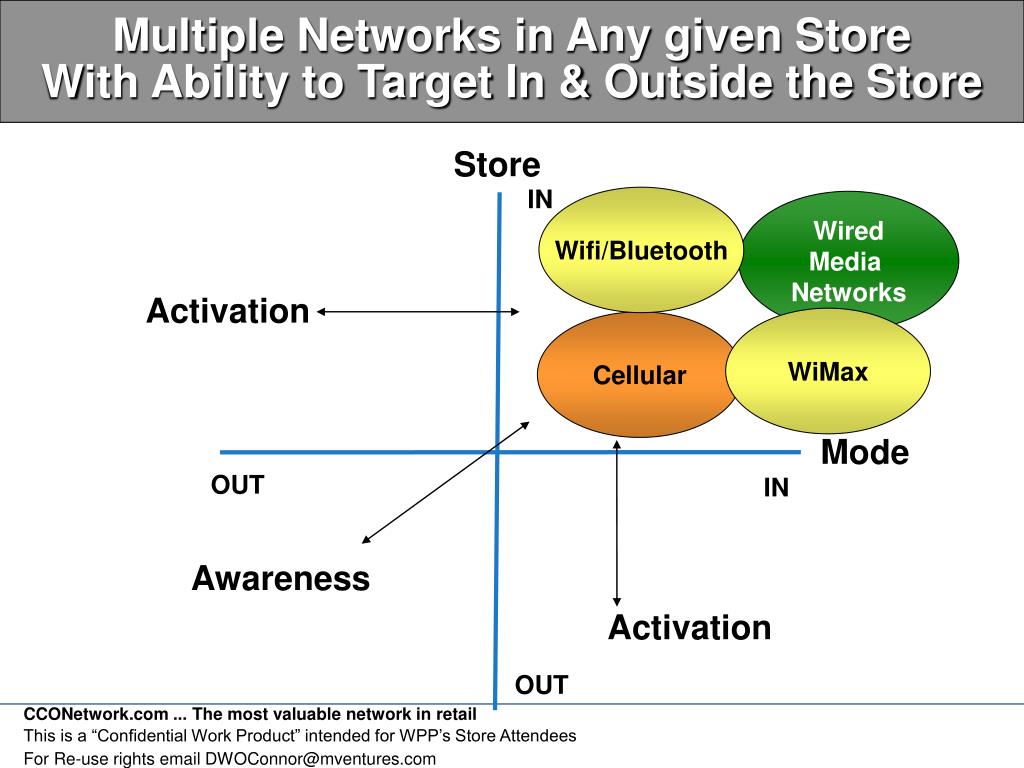 Multiple Networks in Any given StoreWith Ability to Target In & Outside the Store Store IN Wifi/Bluetooth Wired Media Networks Activation WiMax Cellular Mode OUT IN Awareness Activation OUT