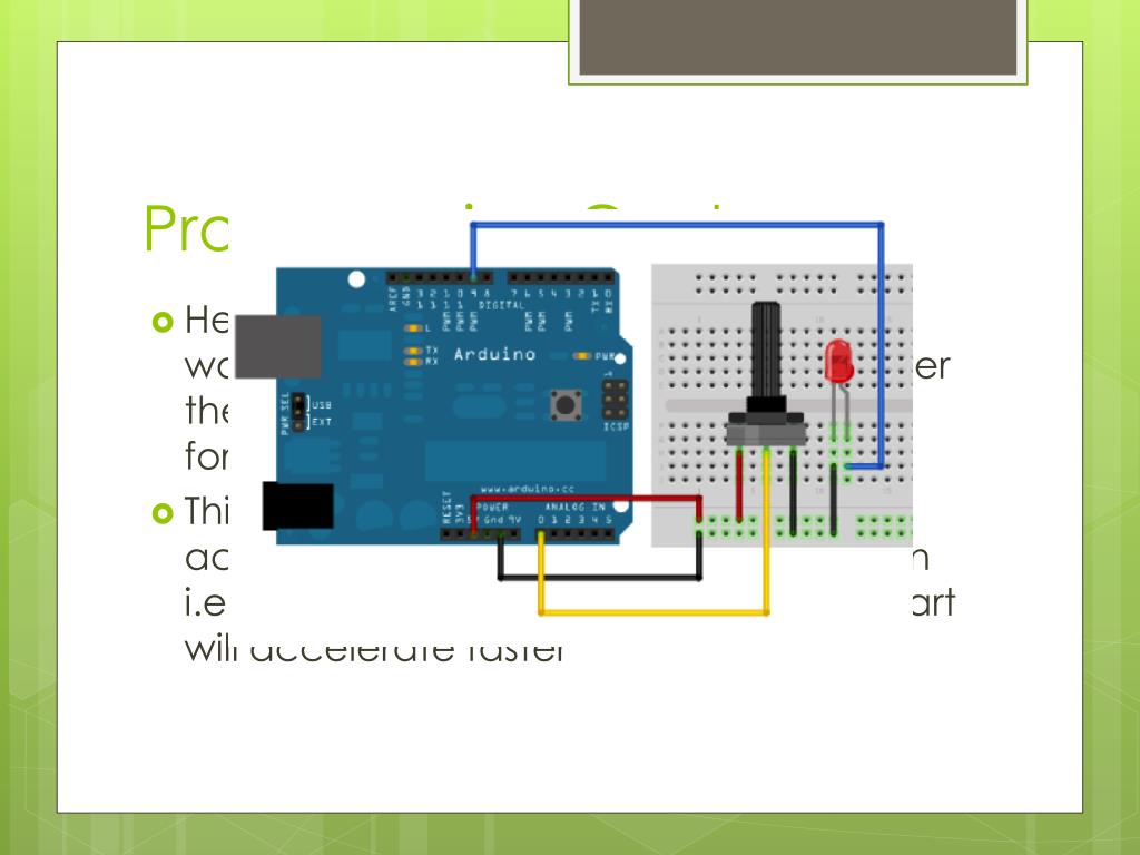 Programming Cont. • He was able to write a program that would cause an LED light to shine brighter the further the joystick was pushed forward • This is what will cause the go kart to accelerate in a linear, controlled fashion i.e. as more pressure is applied the go kart will accelerate faster
