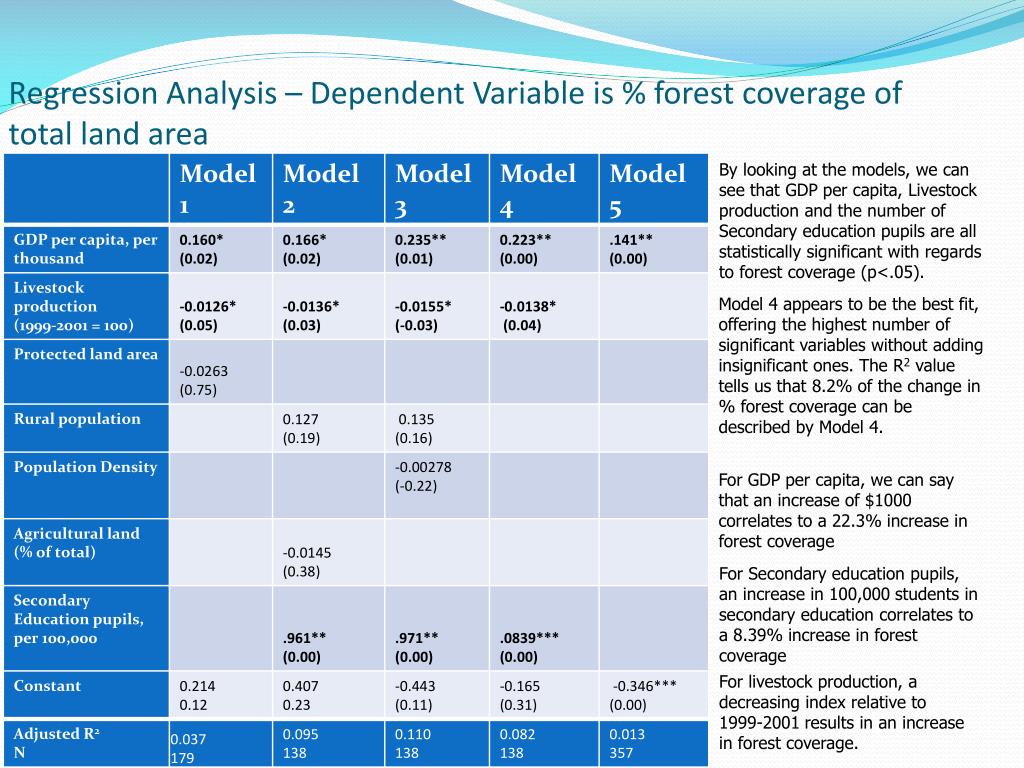 Regression Analysis – Dependent Variable is % forest coverage of total land area By looking at the models, we can see that GDP per capita, Livestock production and the number of Secondary education pupils are all statistically significant with regards to forest coverage (p<.05). Model 4 appears to be the best fit, offering the highest number of significant variables without adding insignificant ones. The R2 value tells us that 8.2% of the change in % forest coverage can be described by Model 4. For GDP per capita, we can say that an increase of $1000 correlates to a 22.3% increase in forest coverage For Secondary education pupils, an increase in 100,000 students in secondary education correlates to a 8.39% increase in forest coverage For livestock production, a decreasing index relative to 1999-2001 results in an increase in forest coverage.