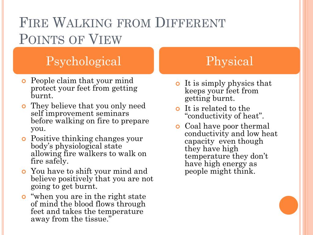 Fire Walking from Different Points of View Psychological Physical • People claim that your mind protect your feet from getting burnt. • They believe that you only need self improvement seminars before walking on fire to prepare you. • Positive thinking changes your body’s physiological state allowing fire walkers to walk on fire safely. • You have to shift your mind and believe positively that you are not going to get burnt. • “when you are in the right state of mind the blood flows through feet and takes the temperature away from the tissue.” • It is simply physics that keeps your feet from getting burnt. • It is related to the “conductivity of heat”. • Coal have poor thermal conductivity and low heat capacity even though they have high temperature they don’t have high energy as people might think.