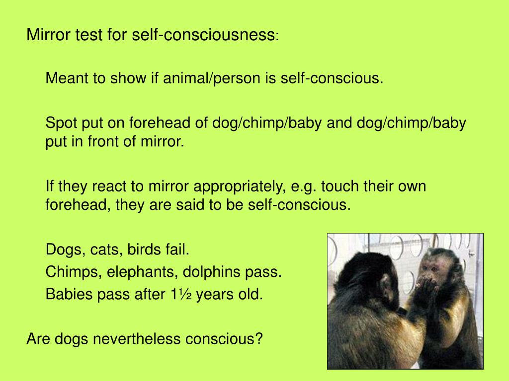 Mirror test for self-consciousness: Meant to show if animal/person is self-conscious. Spot put on forehead of dog/chimp/baby and dog/chimp/baby put in front of mirror. If they react to mirror appropriately, e.g. touch their own forehead, they are said to be self-conscious. Dogs, cats, birds fail. Chimps, elephants, dolphins pass. Babies pass after 1½ years old. Are dogs nevertheless conscious?