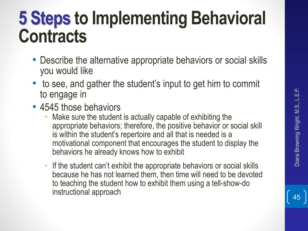 5 Steps to Implementing Behavioral Contracts 4. Teacher implementation of pre correction and prompting • The promptingtactic consists of responding to incidents of the student’s problem behavior by cueing him to engage in the appropriate behavior or social skill outlined on the contract and reminding him of the reward to be earned If the behavior problem continues despite providing a few prompts, then the teacher should carry out the typical progressive discipline plan (for example, removal of privileges, reprimands, in-class time-out, office referral) Diana Browning Wright, M.S., L.E.P.