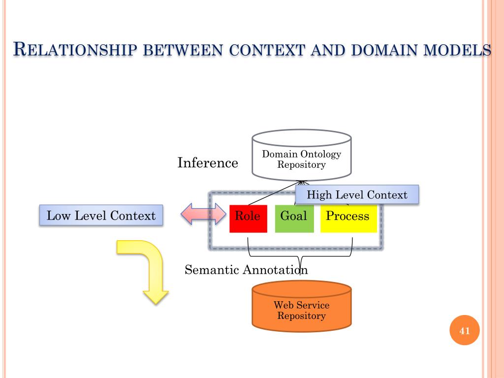Relationship between context and domain models Domain Ontology Repository Inference High Level Context Low Level Context Role Goal Process Semantic Annotation Web Service Repository