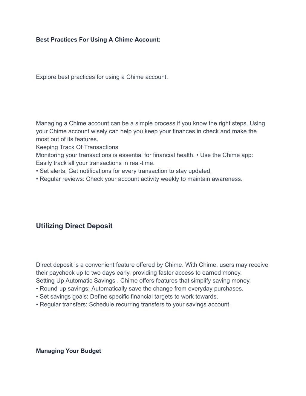 Best Practices For Using A Chime Account: Explore best practices for using a Chime account. Managing a Chime account can be a simple process if you know the right steps. Using your Chime account wisely can help you keep your finances in check and make the most out of its features. Keeping Track Of Transactions Monitoring your transactions is essential for financial health. • Use the Chime app: Easily track all your transactions in real-time. • Set alerts: Get notifications for every transaction to stay updated. • Regular reviews: Check your account activity weekly to maintain awareness. Utilizing Direct Deposit Direct deposit is a convenient feature offered by Chime. With Chime, users may receive their paycheck up to two days early, providing faster access to earned money. Setting Up Automatic Savings . Chime offers features that simplify saving money. • Round-up savings: Automatically save the change from everyday purchases. • Set savings goals: Define specific financial targets to work towards. • Regular transfers: Schedule recurring transfers to your savings account. Managing Your Budget