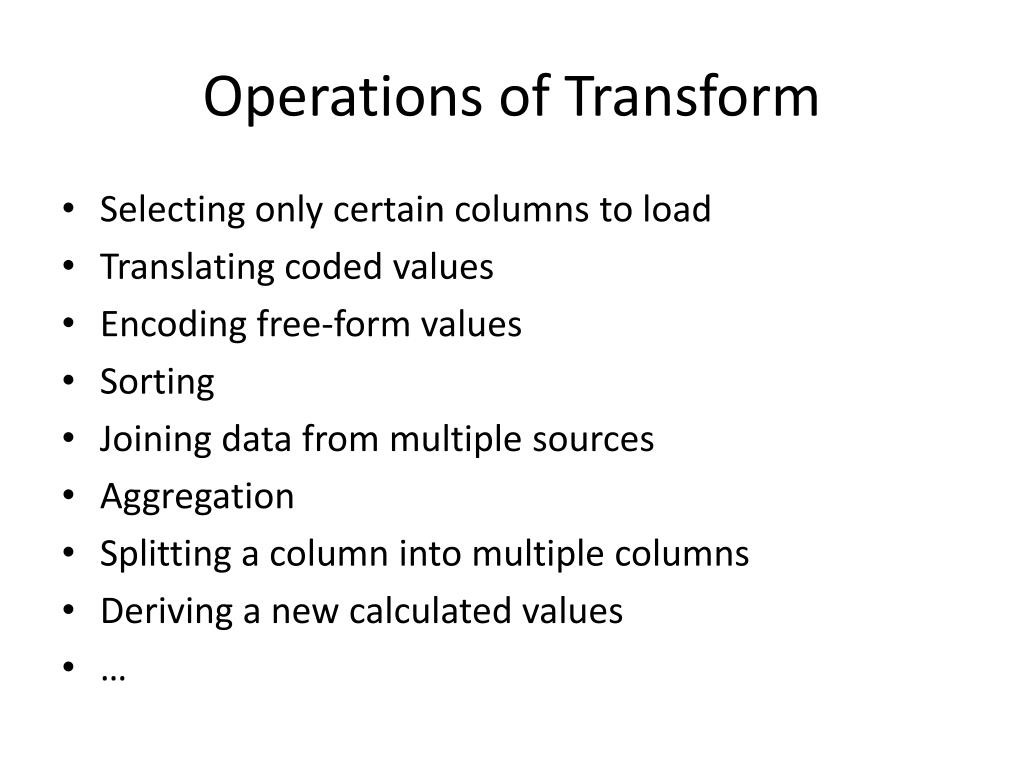Operations of Transform • Selectingonlycertaincolumnstoload • Translatingcodedvalues • Encodingfree-formvalues • Sorting • Joiningdatafrommultiplesources • Aggregation • Splittingacolumnintomultiplecolumns • Derivinganewcalculatedvalues • …