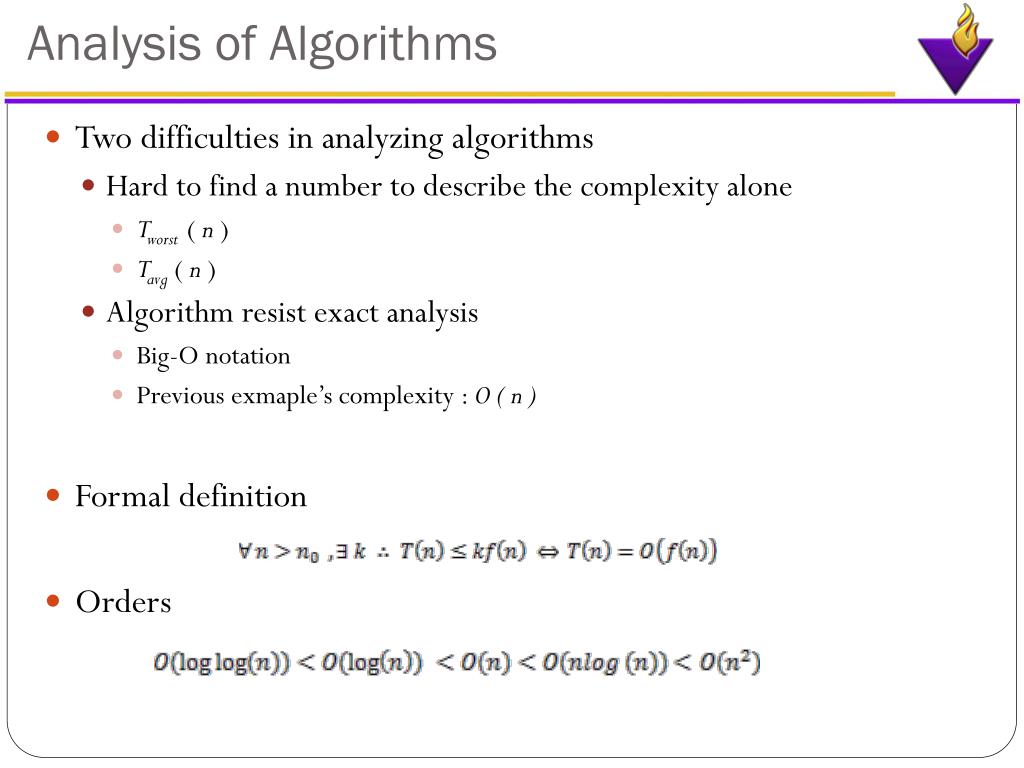 Analysis of Algorithms • Two difficulties in analyzing algorithms • Hard to find a number to describe the complexity alone • Tworst ( n ) • Tavg( n ) • Algorithm resist exact analysis • Big-O notation • Previous exmaple’s complexity : O ( n ) • Formal definition • Orders