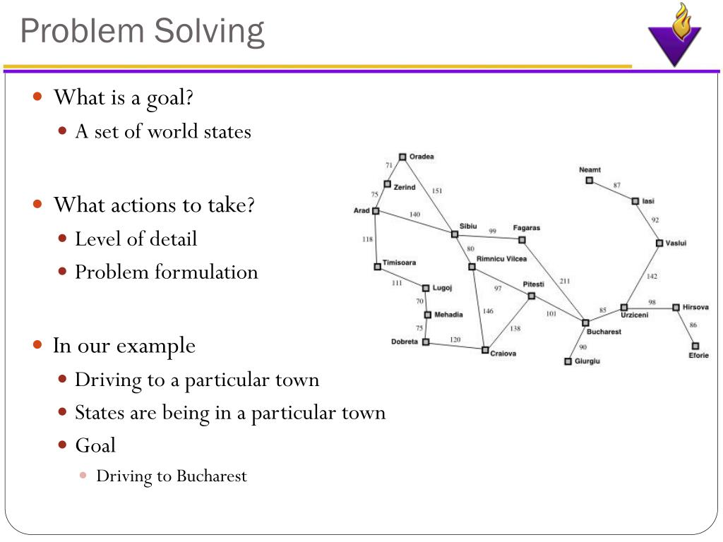 Problem Solving • What is a goal? • A set of world states • What actions to take? • Level of detail • Problem formulation • In our example • Driving to a particular town • States are being in a particular town • Goal • Driving to Bucharest
