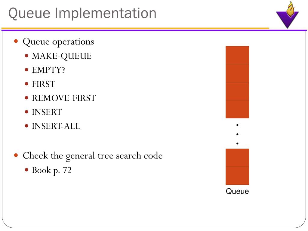 Queue Implementation • Queue operations • MAKE-QUEUE • EMPTY? • FIRST • REMOVE-FIRST • INSERT • INSERT-ALL • Check the general tree search code • Book p. 72 Queue