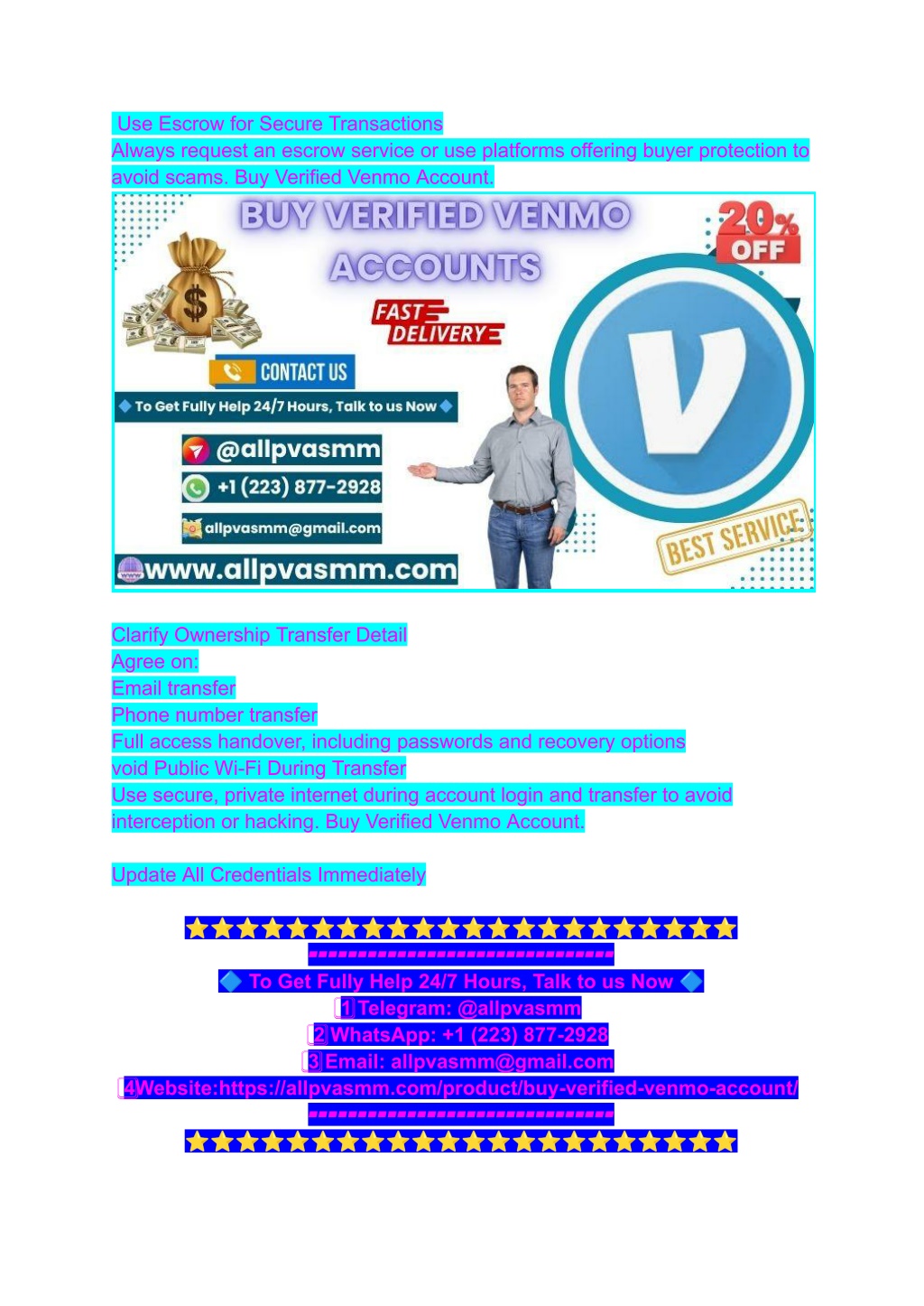 Use Escrow for Secure Transactions Always request an escrow service or use platforms offering buyer protection to avoid scams. Buy Verified Venmo Account. Clarify Ownership Transfer Detail Agree on: Email transfer Phone number transfer Full access handover, including passwords and recovery options void Public Wi-Fi During Transfer Use secure, private internet during account login and transfer to avoid interception or hacking. Buy Verified Venmo Account. Update All Credentials Immediately ⭐⭐⭐⭐⭐⭐⭐⭐⭐⭐⭐⭐⭐⭐⭐⭐⭐⭐⭐⭐⭐⭐ ▰▰▰▰▰▰▰▰▰▰▰▰▰▰▰▰▰▰▰▰▰▰▰▰▰▰▰▰▰▰▰ ? To Get Fully Help 24/7 Hours, Talk to us Now ? 1⃣ Telegram: @allpvasmm 2⃣ WhatsApp: +1 (223) 877-2928 3⃣ Email: allpvasmm@gmail.com 4⃣Website:https://allpvasmm.com/product/buy-verified-venmo-account/ ▰▰▰▰▰▰▰▰▰▰▰▰▰▰▰▰▰▰▰▰▰▰▰▰▰▰▰▰▰▰▰ ⭐⭐⭐⭐⭐⭐⭐⭐⭐⭐⭐⭐⭐⭐⭐⭐⭐⭐⭐⭐⭐⭐