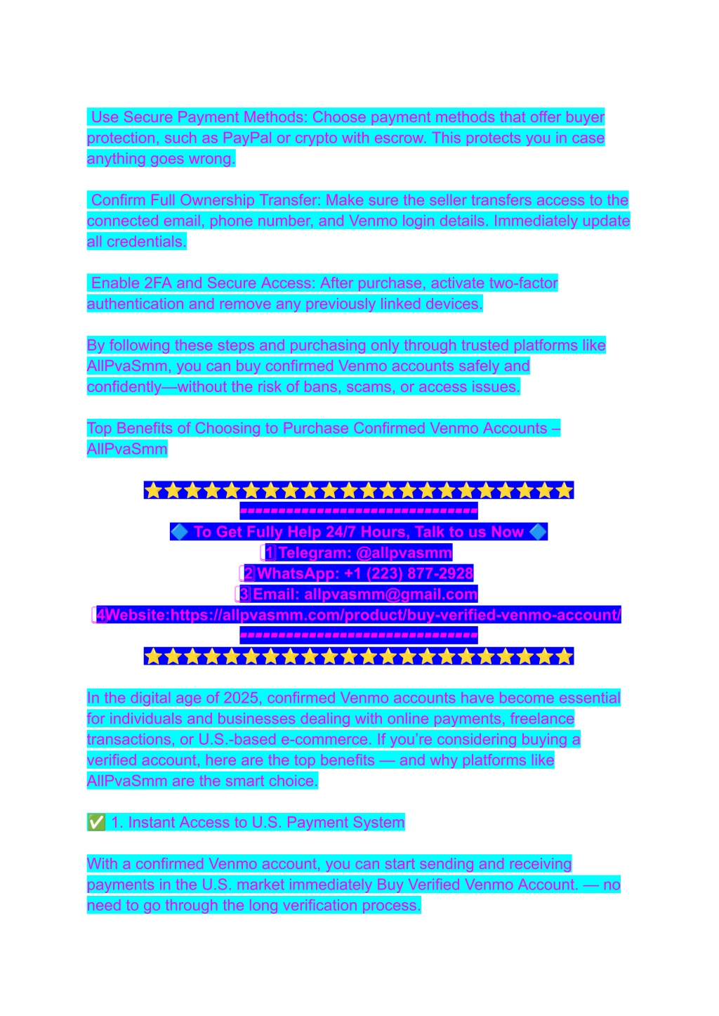 Use Secure Payment Methods: Choose payment methods that offer buyer protection, such as PayPal or crypto with escrow. This protects you in case anything goes wrong. Confirm Full Ownership Transfer: Make sure the seller transfers access to the connected email, phone number, and Venmo login details. Immediately update all credentials. Enable 2FA and Secure Access: After purchase, activate two-factor authentication and remove any previously linked devices. By following these steps and purchasing only through trusted platforms like AllPvaSmm, you can buy confirmed Venmo accounts safely and confidently—without the risk of bans, scams, or access issues. Top Benefits of Choosing to Purchase Confirmed Venmo Accounts – AllPvaSmm ⭐⭐⭐⭐⭐⭐⭐⭐⭐⭐⭐⭐⭐⭐⭐⭐⭐⭐⭐⭐⭐⭐ ▰▰▰▰▰▰▰▰▰▰▰▰▰▰▰▰▰▰▰▰▰▰▰▰▰▰▰▰▰▰▰ ? To Get Fully Help 24/7 Hours, Talk to us Now ? 1⃣ Telegram: @allpvasmm 2⃣ WhatsApp: +1 (223) 877-2928 3⃣ Email: allpvasmm@gmail.com 4⃣Website:https://allpvasmm.com/product/buy-verified-venmo-account/ ▰▰▰▰▰▰▰▰▰▰▰▰▰▰▰▰▰▰▰▰▰▰▰▰▰▰▰▰▰▰▰ ⭐⭐⭐⭐⭐⭐⭐⭐⭐⭐⭐⭐⭐⭐⭐⭐⭐⭐⭐⭐⭐⭐ In the digital age of 2025, confirmed Venmo accounts have become essential for individuals and businesses dealing with online payments, freelance transactions, or U.S.-based e-commerce. If you’re considering buying a verified account, here are the top benefits — and why platforms like AllPvaSmm are the smart choice. ✅ 1. Instant Access to U.S. Payment System With a confirmed Venmo account, you can start sending and receiving payments in the U.S. market immediately Buy Verified Venmo Account. — no need to go through the long verification process.