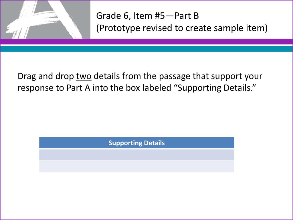 Grade 6, Item #5—Part B(Prototype revised to create sample item) Drag and drop two details from the passage that support your response to Part A into the box labeled “Supporting Details.”