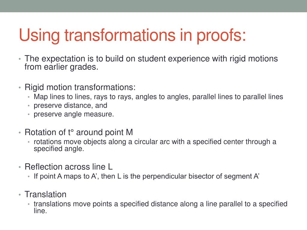 Using transformations in proofs: • The expectation is to build on student experience with rigid motions from earlier grades. • Rigid motion transformations: • Map lines to lines, rays to rays, angles to angles, parallel lines to parallel lines • preserve distance, and • preserve angle measure. • Rotation of t° around point M • rotations move objects along a circular arc with a specified center through a specified angle. • Reflection across line L • If point A maps to A’, then L is the perpendicular bisector of segment A’ • Translation • translations move points a specified distance along a line parallel to a specified line.