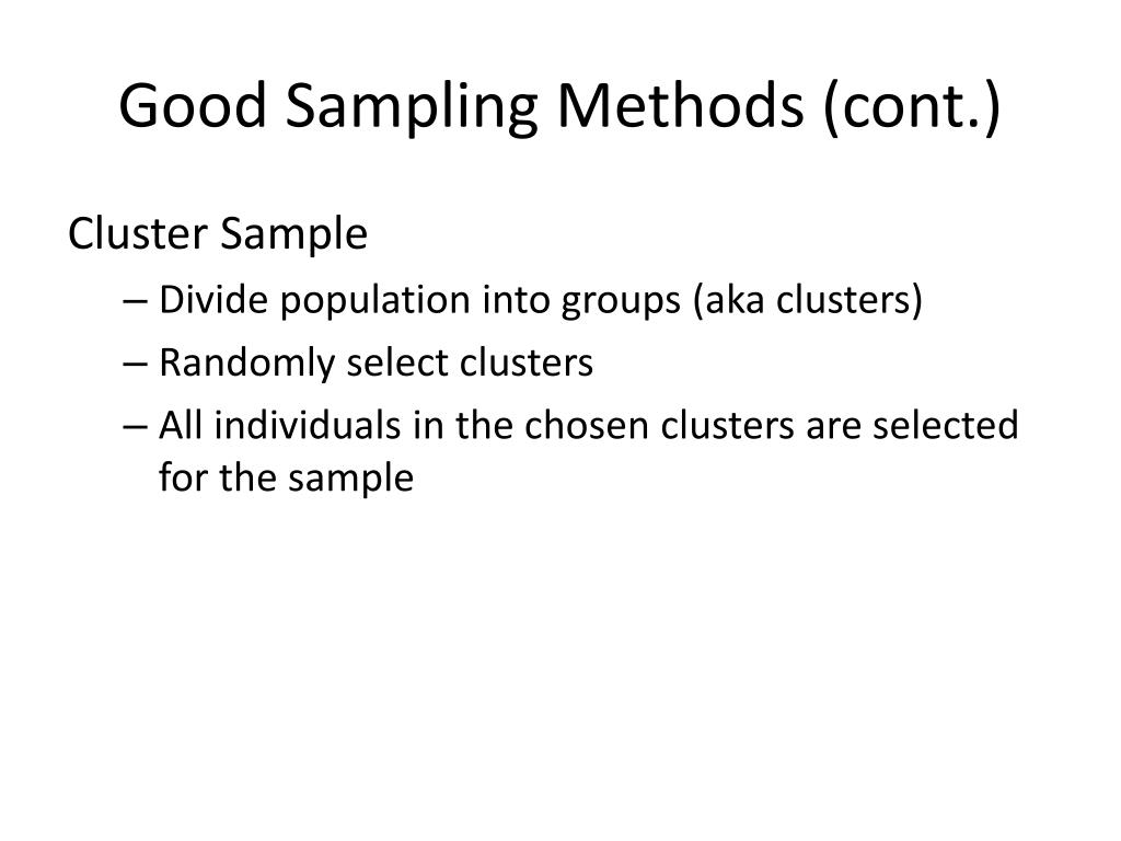 Good Sampling Methods (cont.) Cluster Sample • Divide population into groups (aka clusters) • Randomly select clusters • All individuals in the chosen clusters are selected for the sample
