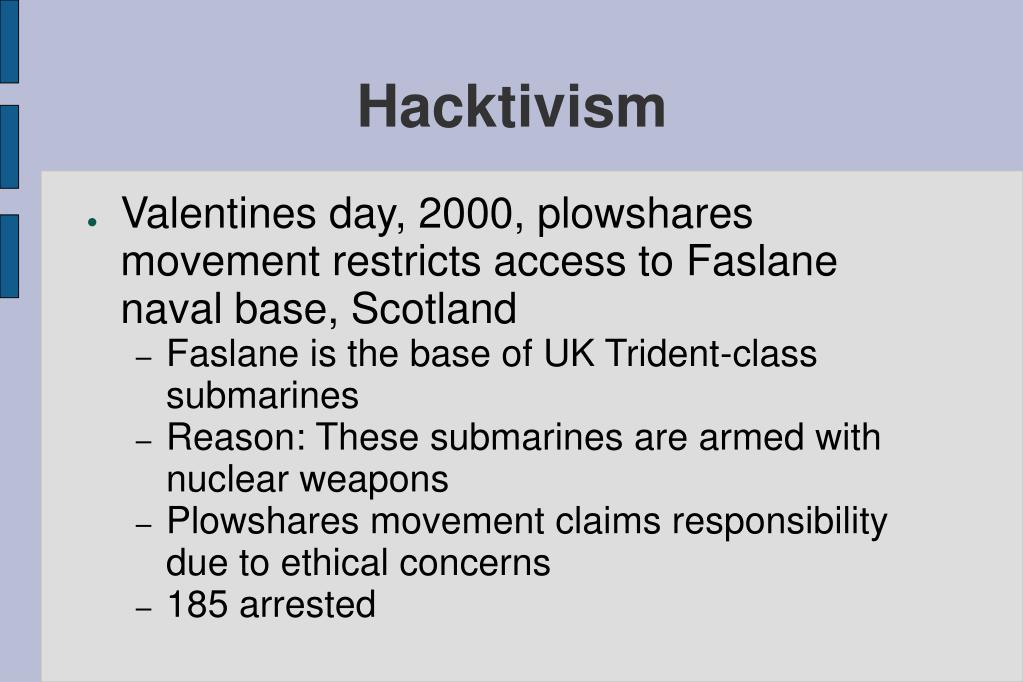 Hacktivism • Valentines day, 2000, plowshares movement restricts access to Faslane naval base, Scotland • Faslane is the base of UK Trident-class submarines • Reason: These submarines are armed with nuclear weapons • Plowshares movement claims responsibility due to ethical concerns • 185 arrested