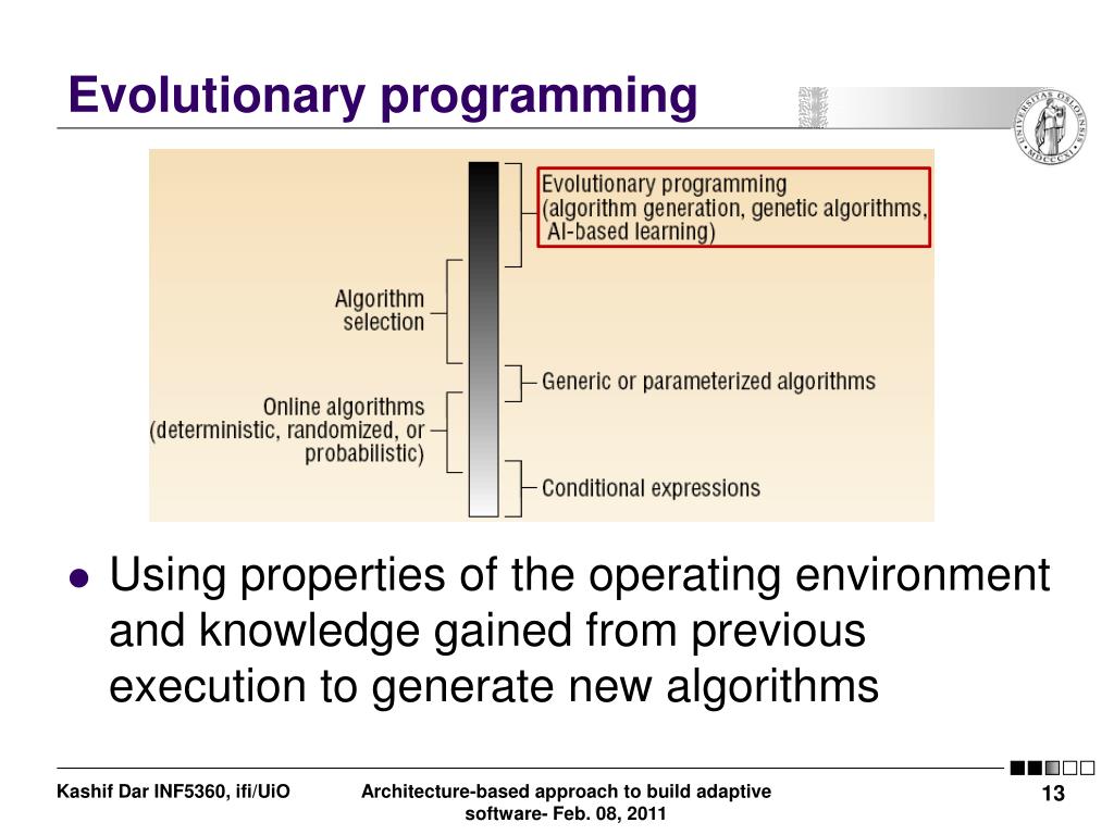 Evolutionary programming Architecture-based approach to build adaptive software- Feb. 08, 2011 Using properties of the operating environment and knowledge gained from previous execution to generate new algorithms