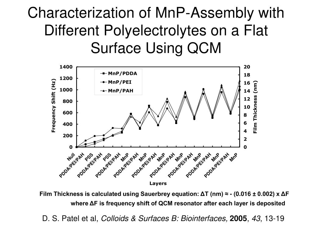 Characterization of MnP-Assembly with Different Polyelectrolytes on a Flat Surface Using QCM Film Thickness is calculated using Sauerbrey equation: ΔT (nm) ≈ - (0.016 ± 0.002) x ΔF where ΔF is frequency shift of QCM resonator after each layer is deposited D. S. Patel et al, Colloids & Surfaces B: Biointerfaces,2005, 43, 13-19