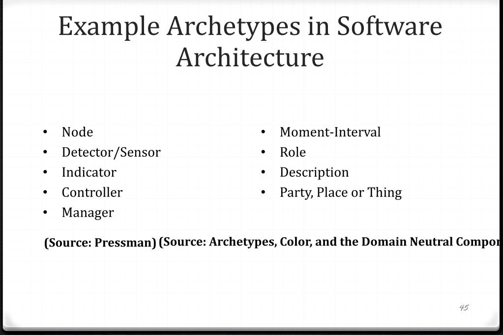 Example Archetypes in Software Architecture • Node • Detector/Sensor • Indicator • Controller • Manager • Moment-Interval • Role • Description • Party, Place or Thing (Source: Archetypes, Color, and the Domain Neutral Component) (Source: Pressman)