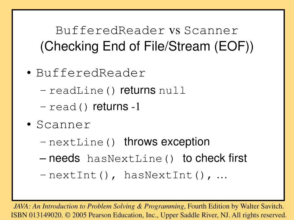 BufferedReader vs Scanner(Checking End of File/Stream (EOF)) • BufferedReader • readLine()returnsnull • read()returns -1 • Scanner • nextLine() throws exception • needs hasNextLine() to check first • nextInt(), hasNextInt(), …