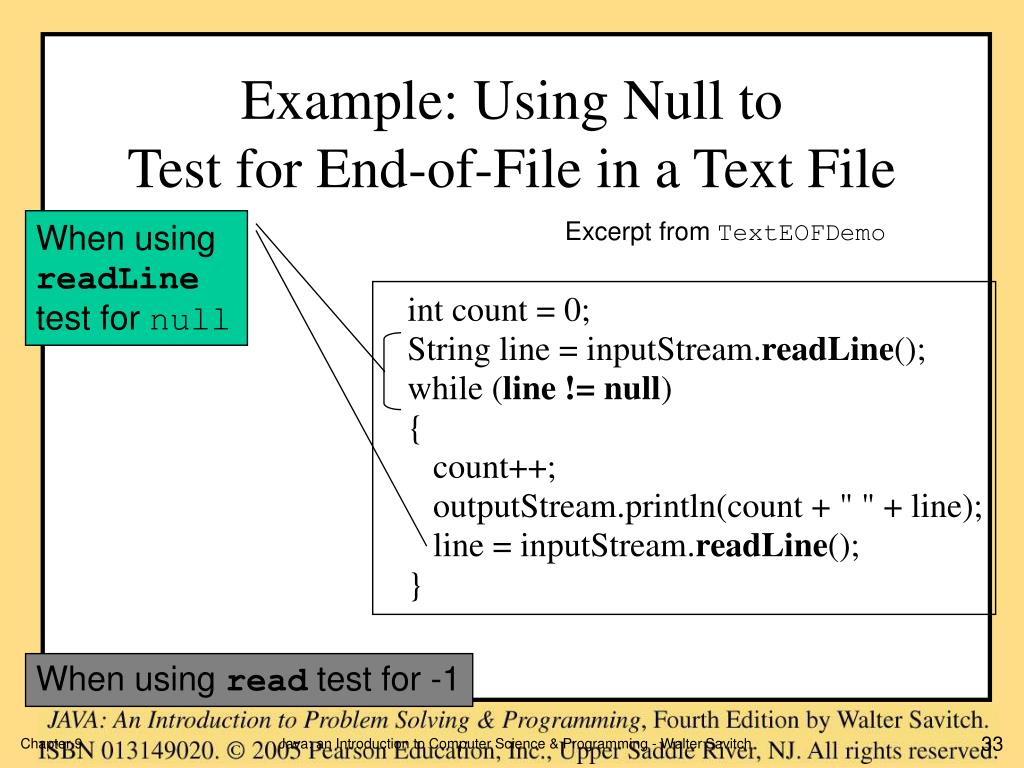 Example: Using Null toTest for End-of-File in a Text File When using readLine test for null Excerpt from TextEOFDemo When using read test for -1 33 Chapter 9 Java: an Introduction to Computer Science & Programming - Walter Savitch