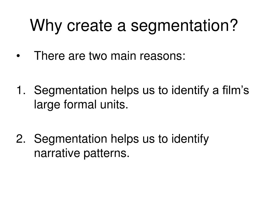Why create a segmentation? • There are two main reasons: • Segmentation helps us to identify a film’s large formal units. • Segmentation helps us to identify narrative patterns.