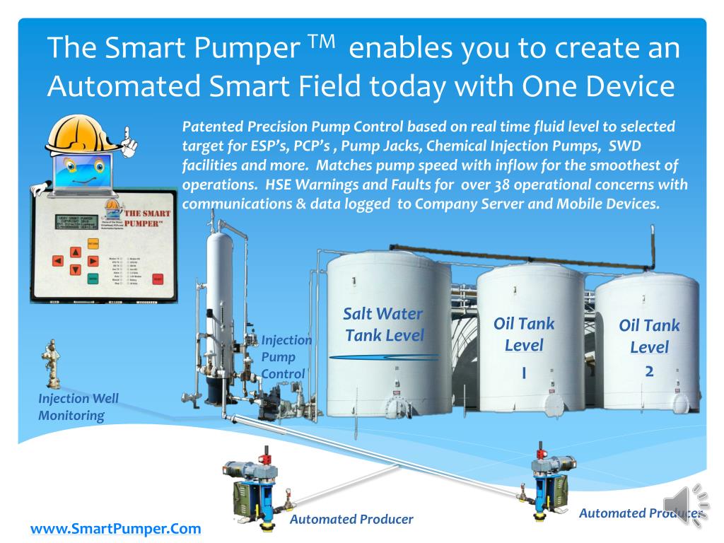 Patented Precision Pump Control based on real time fluid level to selected target for ESP’s, PCP’s , Pump Jacks, Chemical Injection Pumps, SWD facilities and more. Matches pump speed with inflow for the smoothest of operations. HSE Warnings and Faults for over 38 operational concerns with communications & data logged to Company Server and Mobile Devices. The Smart Pumper TM enables you to create an Automated Smart Field today with One Device Injection Pump Control Salt Water Tank Level Oil Tank Level I Oil Tank Level 2 Injection Well Monitoring Automated Producer Automated Producer www.SmartPumper.Com