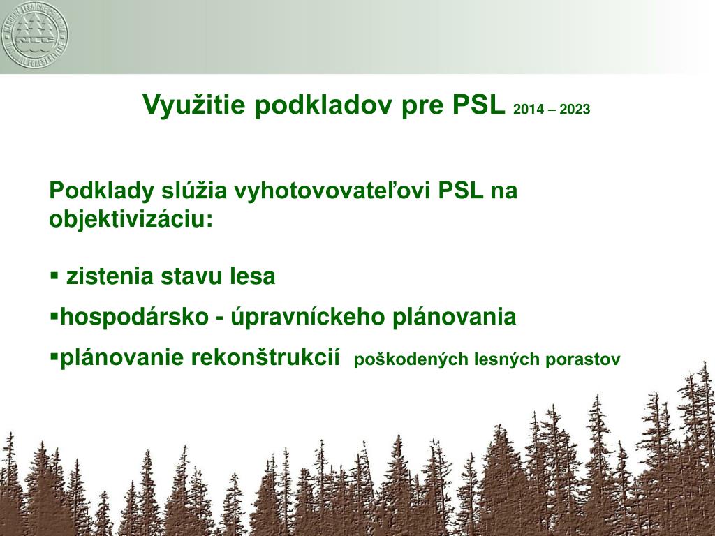 Využitie podkladov pre PSL 2014 – 2023 • Podklady slúžia vyhotovovateľovi PSL na objektivizáciu: • zistenia stavu lesa • hospodársko - úpravníckeho plánovania • plánovanie rekonštrukcií poškodených lesných porastov