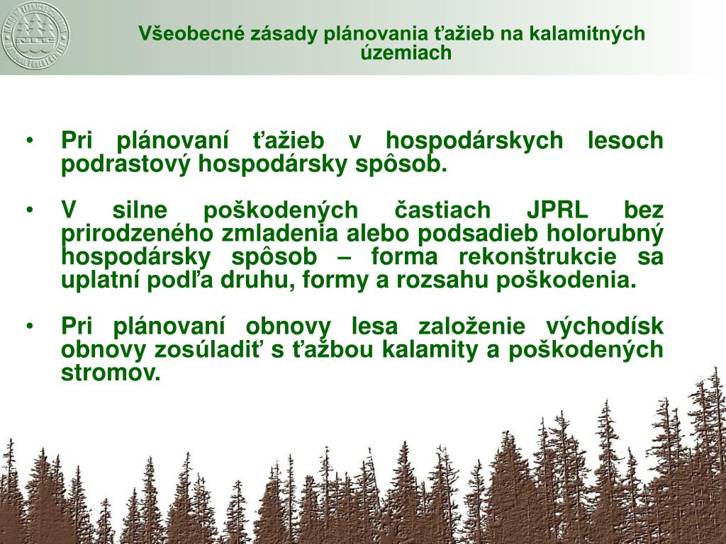 Všeobecné zásady plánovania ťažieb na kalamitných územiach • Pri plánovaní ťažieb v hospodárskych lesoch podrastový hospodársky spôsob. • V silne poškodených častiach JPRL bez prirodzeného zmladenia alebo podsadieb holorubný hospodársky spôsob – forma rekonštrukcie sa uplatní podľa druhu, formy a rozsahu poškodenia. • Pri plánovaní obnovy lesa založenie východísk obnovy zosúladiť s ťažbou kalamity a poškodených stromov.