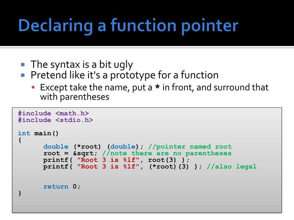 Declaring a function pointer • The syntax is a bit ugly • Pretend like it's a prototype for a function • Except take the name, put a * in front, and surround that with parentheses #include <math.h> #include <stdio.h> int main() { double (*root) (double); //pointer named root root = &sqrt; //note there are no parentheses printf( "Root 3 is %lf", root(3) ); printf( "Root 3 is %lf", (*root)(3) ); //also legal return 0; }