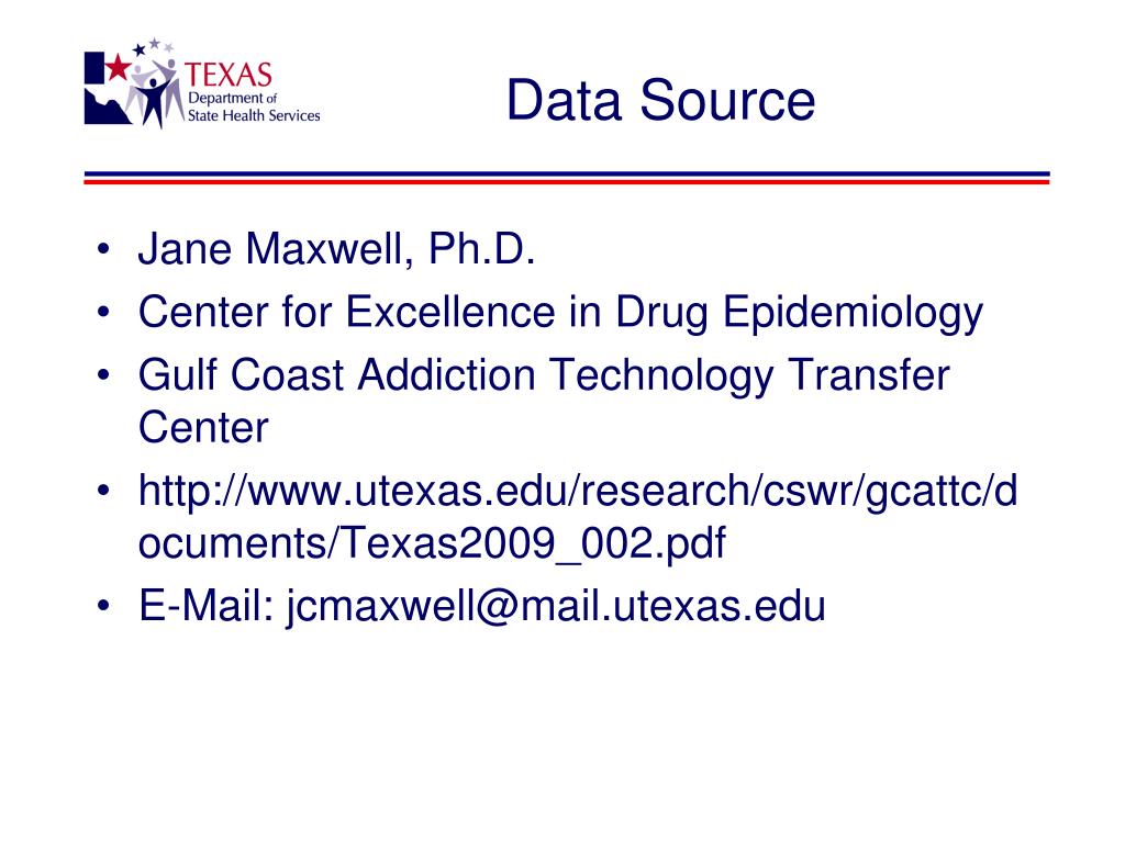 Data Source • Jane Maxwell, Ph.D. • Center for Excellence in Drug Epidemiology • Gulf Coast Addiction Technology Transfer Center • http://www.utexas.edu/research/cswr/gcattc/documents/Texas2009_002.pdf • E-Mail: jcmaxwell@mail.utexas.edu