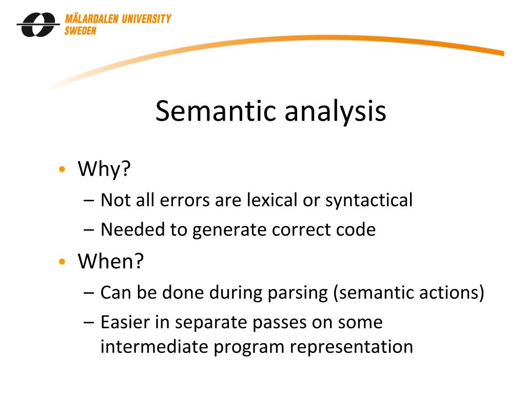 Semantic analysis • Why? • Not all errors are lexical or syntactical • Needed to generate correct code • When? • Can be done during parsing (semantic actions) • Easier in separate passes on some intermediate program representation