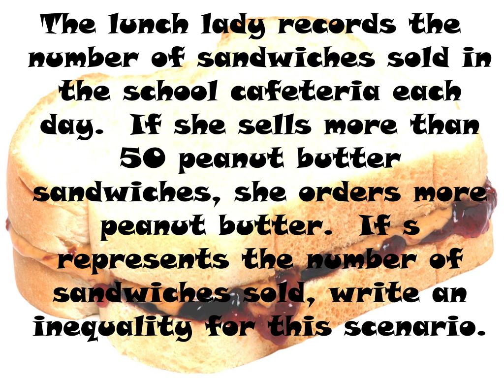 INEQUALITIES. The lunch lady records the number of sandwiches sold in the school cafeteria each day. If she sells more than 50 peanut butter sandwiches, she orders more peanut butter. If s represents the number of sandwiches sold, write an inequality for this scenario. s > 50.