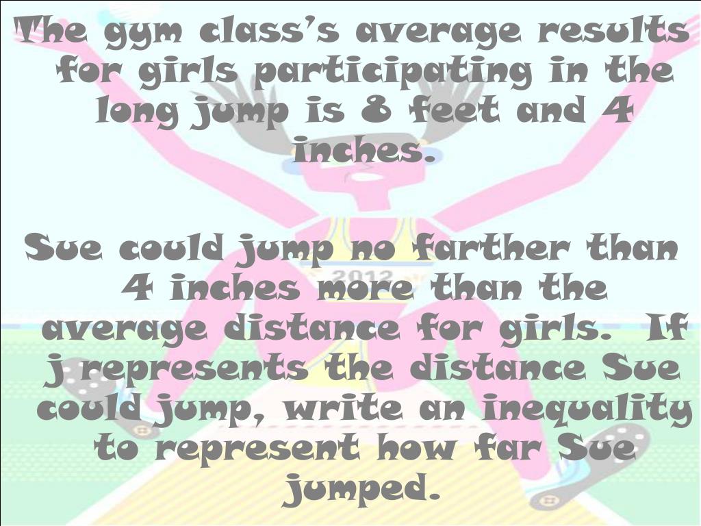 The gym class’s average results for girls participating in the long jump is 8 feet and 4 inches. Sue could jump no farther than 4 inches more than the average distance for girls. If j represents the distance Sue could jump, write an inequality to represent how far Sue jumped.