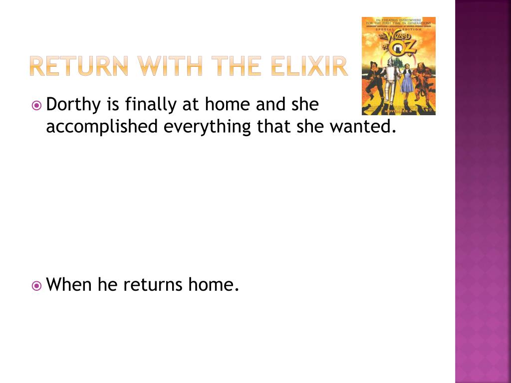 Return with the Elixir • Dorthy is finally at home and she accomplished everything that she wanted. • When he returns home.