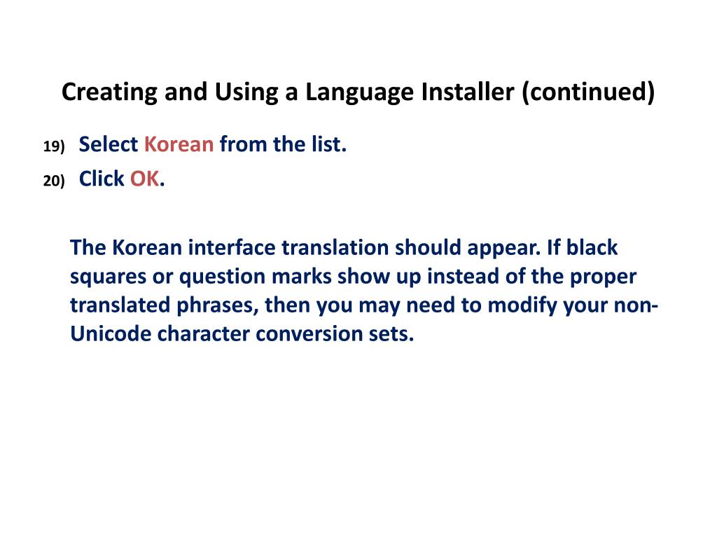 Creating and Using a Language Installer (continued) • Select Korean from the list. • Click OK. The Korean interface translation should appear. If black squares or question marks show up instead of the proper translated phrases, then you may need to modify your non-Unicode character conversion sets.