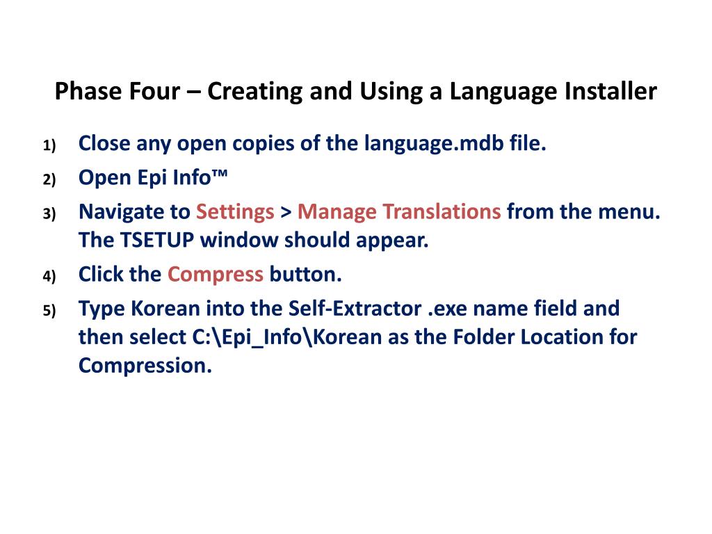 Phase Four – Creating and Using a Language Installer • Close any open copies of the language.mdb file. • Open Epi Info™ • Navigate to Settings > Manage Translations from the menu. The TSETUP window should appear. • Click the Compress button. • Type Korean into the Self-Extractor .exe name field and then select C:\Epi_Info\Korean as the Folder Location for Compression.