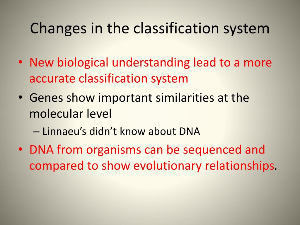Changes in the classification system • New biological understanding lead to a more accurate classification system • Genes show important similarities at the molecular level • Linnaeu’s didn’t know about DNA • DNA from organisms can be sequenced and compared to show evolutionary relationships.