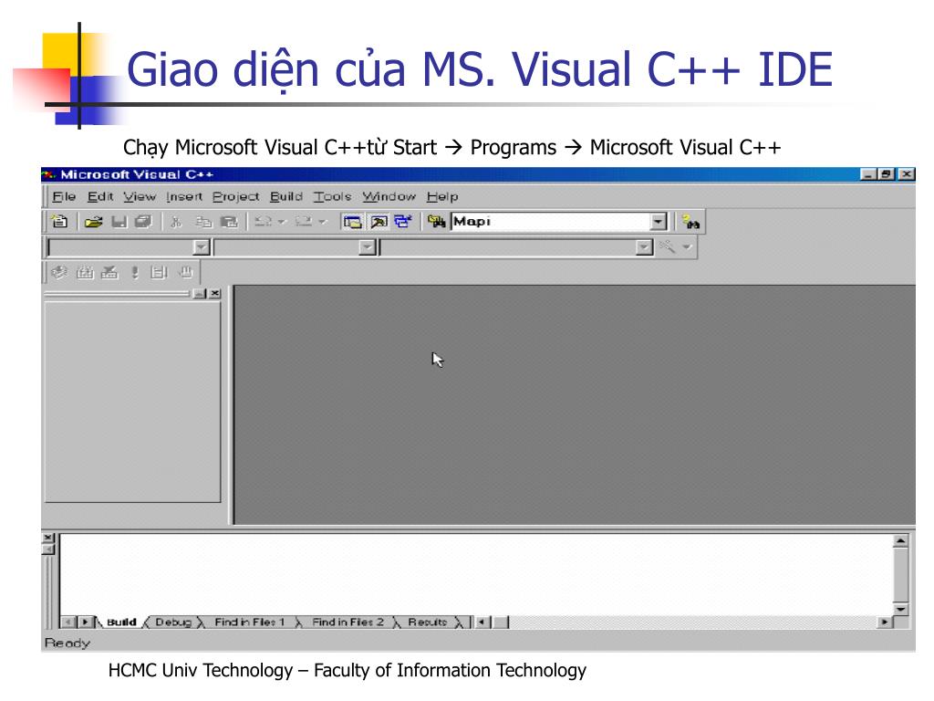 Giao diện của MS. Visual C++ IDE Chạy Microsoft Visual C++từ Start Programs Microsoft Visual C++ HCMC Univ Technology – Faculty of Information Technology