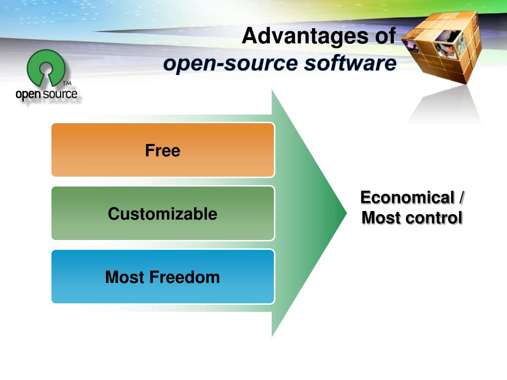 Advantages of open-source software Free Economical / Most control Customizable Most Freedom