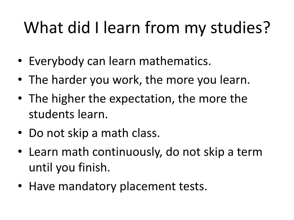 What did I learn from my studies? • Everybody can learn mathematics. • The harder you work, the more you learn. • The higher the expectation, the more the students learn. • Do not skip a math class. • Learn math continuously, do not skip a term until you finish. • Have mandatory placement tests.