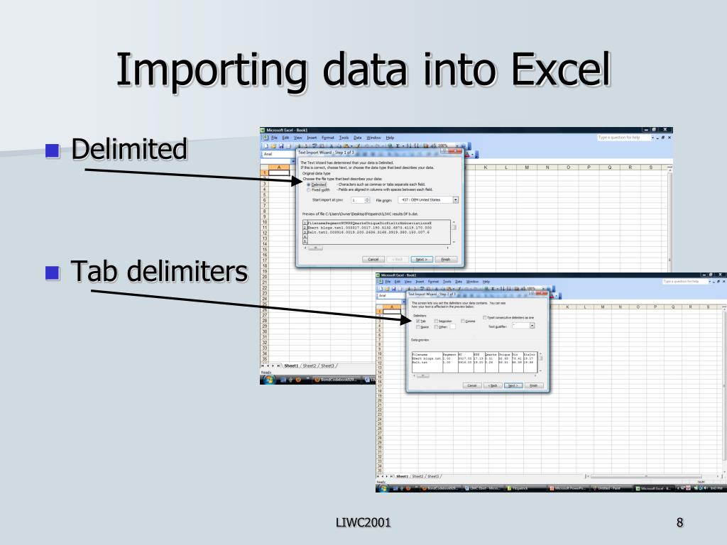 Importing data into Excel • Delimited • Tab delimiters LIWC2001