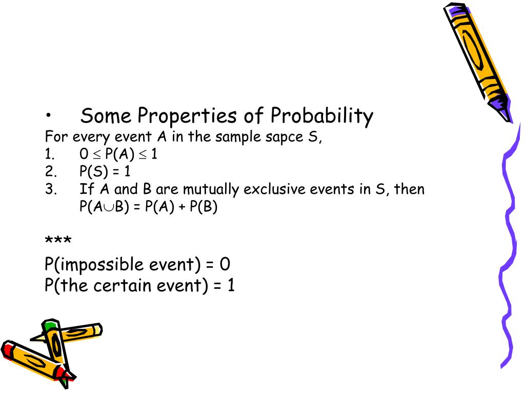 Some Properties of Probability For every event A in the sample sapce S, • 0 P(A) 1 • P(S) = 1 • If A and B are mutually exclusive events in S, then P(AB) = P(A) + P(B) *** P(impossible event) = 0 P(the certain event) = 1