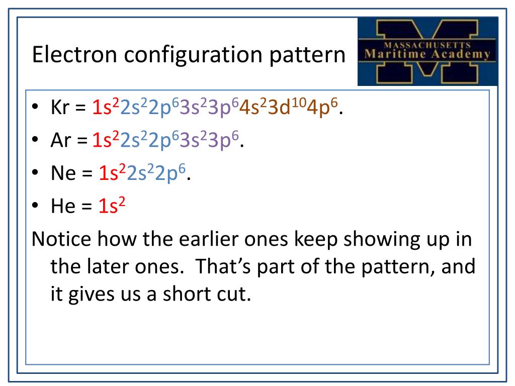 Electron configuration pattern • Kr = 1s22s22p63s23p64s23d104p6. • Ar =1s22s22p63s23p6. • Ne = 1s22s22p6. • He = 1s2 Notice how the earlier ones keep showing up in the later ones. That’s part of the pattern, and it gives us a short cut.