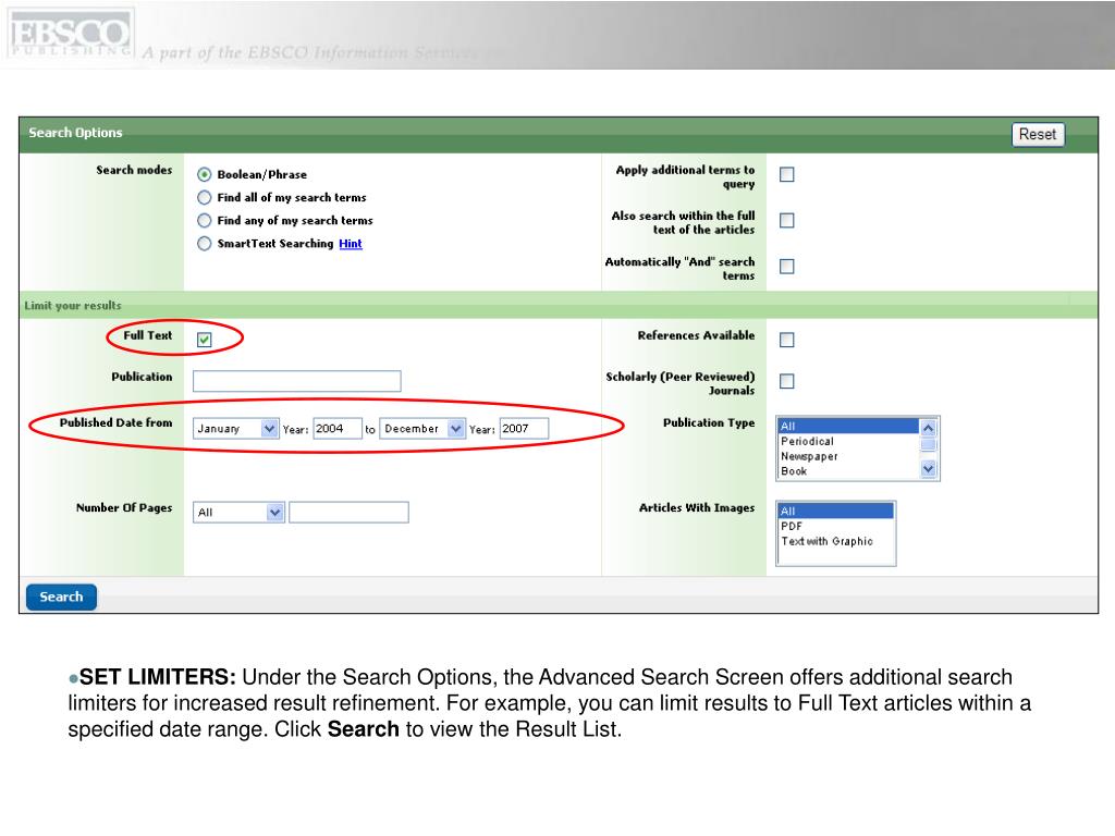SET LIMITERS: Under the Search Options, the Advanced Search Screen offers additional search limiters for increased result refinement. For example, you can limit results to Full Text articles within a specified date range. Click Search to view the Result List.