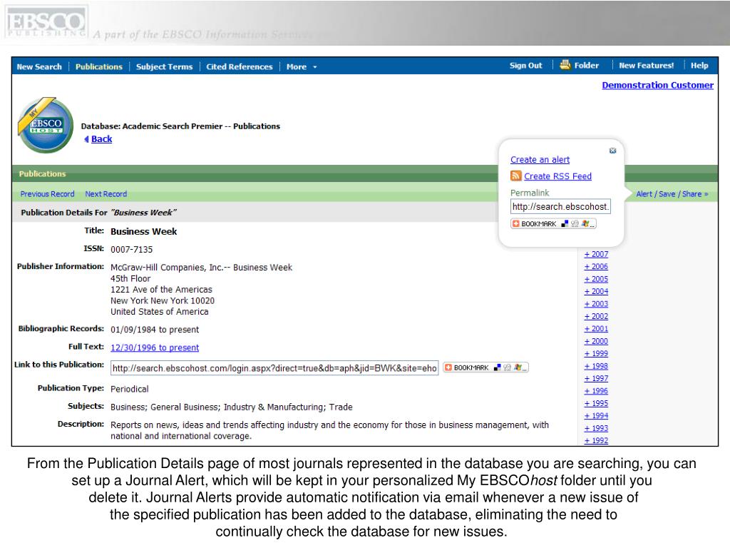 From the Publication Details page of most journals represented in the database you are searching, you can set up a Journal Alert, which will be kept in your personalized My EBSCOhost folder until you delete it. Journal Alerts provide automatic notification via email whenever a new issue of the specified publication has been added to the database, eliminating the need to continually check the database for new issues.