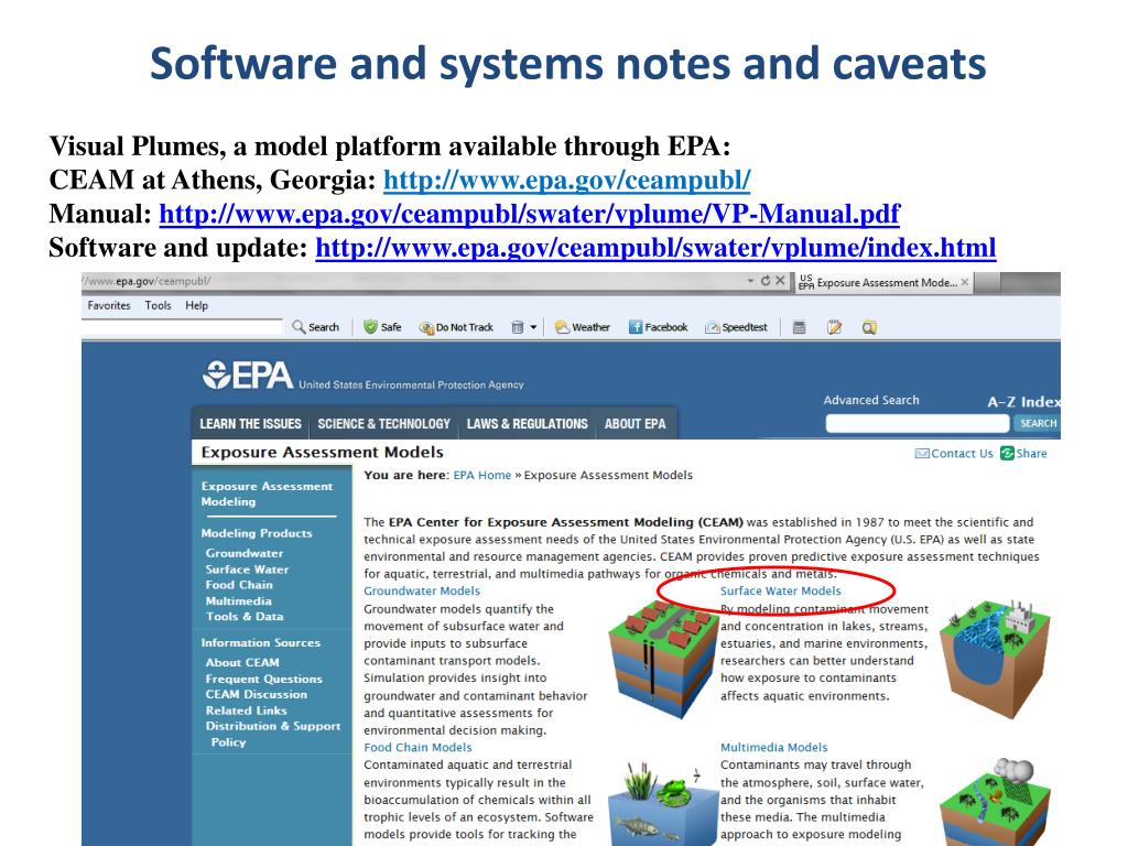 Visual Plumes, a model platform available through EPA: • CEAM at Athens, Georgia: http://www.epa.gov/ceampubl/ • Manual: http://www.epa.gov/ceampubl/swater/vplume/VP-Manual.pdf • Software and update: http://www.epa.gov/ceampubl/swater/vplume/index.html Software and systems notes and caveats EPA Modeling Webinar 22-24 Jan 2013