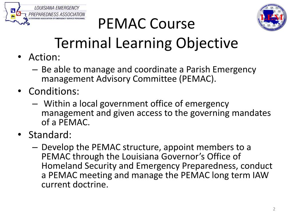 Parish Emergency Management Advisory Committee. Louisiana Emergency Preparedness Association (LEPA) An LEM Basic Credentialing Course. PEMAC Course Terminal Learning Objective. Action: Be able to manage and coordinate a Parish Emergency management Advisory Committee (PEMAC). Conditions: