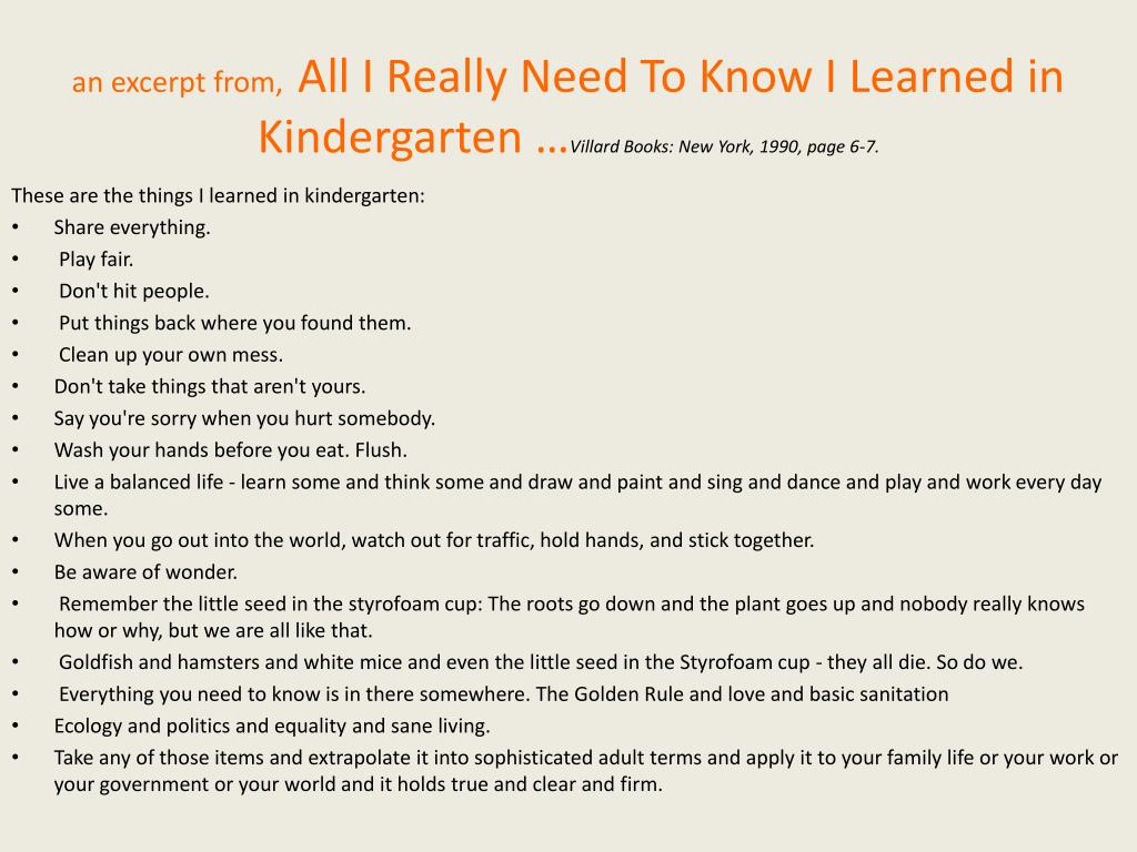 an excerpt from, All I Really Need To Know I Learned in Kindergarten …Villard Books: New York, 1990, page 6-7. These are the things I learned in kindergarten: Share everything. Play fair. Don't hit people. Put things back where you found them. Clean up your own mess. Don't take things that aren't yours. Say you're sorry when you hurt somebody. Wash your hands before you eat. Flush. Live a balanced life - learn some and think some and draw and paint and sing and dance and play and work every day some. When you go out into the world, watch out for traffic, hold hands, and stick together. Be aware of wonder. Remember the little seed in the styrofoam cup: The roots go down and the plant goes up and nobody really knows how or why, but we are all like that. Goldfish and hamsters and white mice and even the little seed in the Styrofoam cup - they all die. So do we. Everything you need to know is in there somewhere. The Golden Rule and love and basic sanitation Ecology and politics and equality and sane living. Take any of those items and extrapolate it into sophisticated adult terms and apply it to your family life or your work or your government or your world and it holds true and clear and firm.