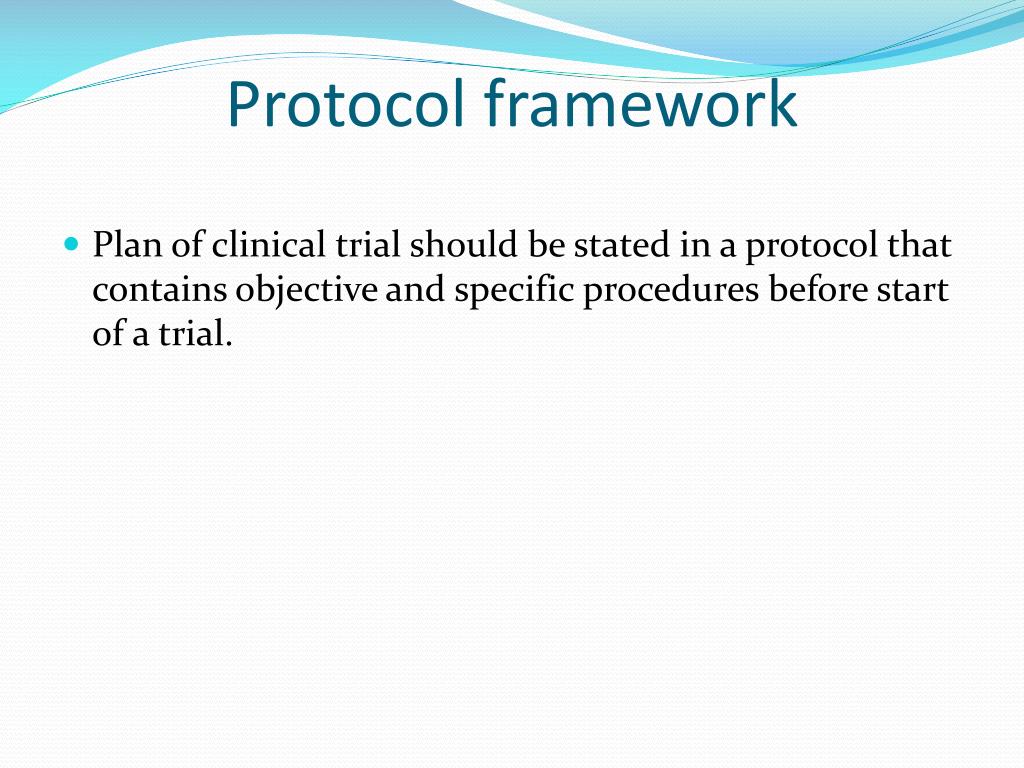 Protocol framework • Plan of clinical trial should be stated in a protocol that contains objective and specific procedures before start of a trial.